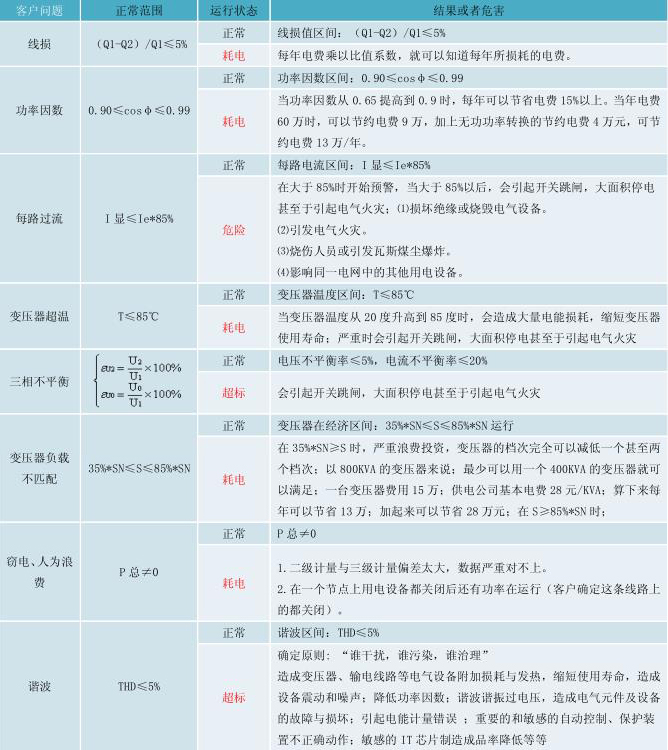 通過在線全天候自動監(jiān)測用電用戶的線損、功率因數(shù)、每路過流、變壓器超溫,變壓器負(fù)載是否匹配、三相電流電壓是否平衡、有無人為浪費或人為竊電行為及諧波等八大問題,并在云端數(shù)據(jù)自動形成電能分、時、日、月、年曲線圖,自動分析、建模,自動巡檢、自動鎖定故障點并報警,及時處理故障,減少因以上問題所帶來對企業(yè)正常生產(chǎn)的影響,為企業(yè)安全生產(chǎn)保駕護(hù)航。
